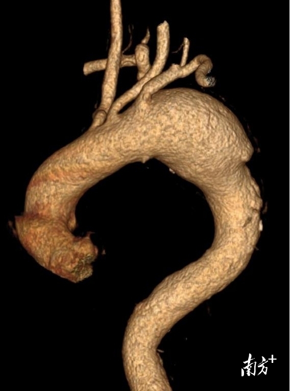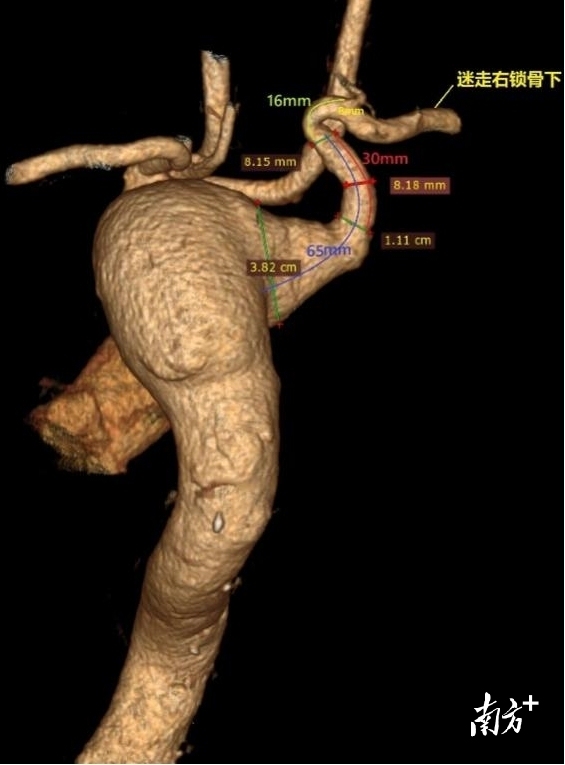 患者麦先生五十多岁,半年前因消化道出血就医时偶然发现腹主动脉瘤。五个月后复查显示,病情进一步复杂化:腹主动脉瘤持续增大,同时胸腔内主动脉弓上还长出一个直径达6厘米的动脉瘤。更为棘手的是,其右锁骨下动脉并未生长在正常右侧位置,而是“迷走”至左侧,且该血管根部出现瘤样扩张(医学上称为Kommerell憩室),恰从主动脉弓的瘤体上发出。