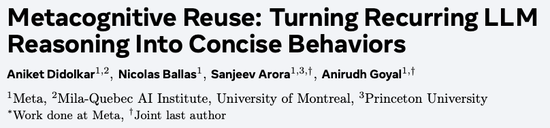 Meta、Mila-Quebec AI Institute、蒙特利尔大学和普林斯顿大学联合提出元认知复用(Metacognitive Reuse) 机制。